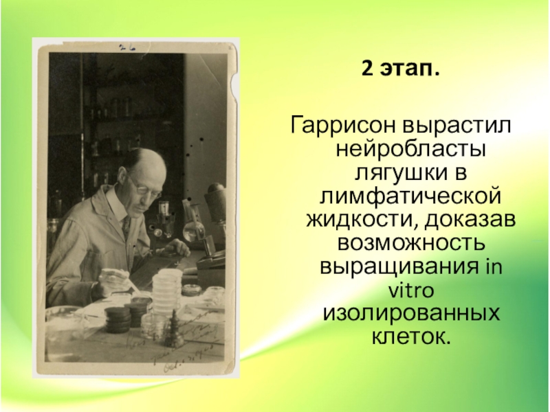 Гаррисон вырастил нейробласты лягушки в лимфатической жидкости, доказав возможность