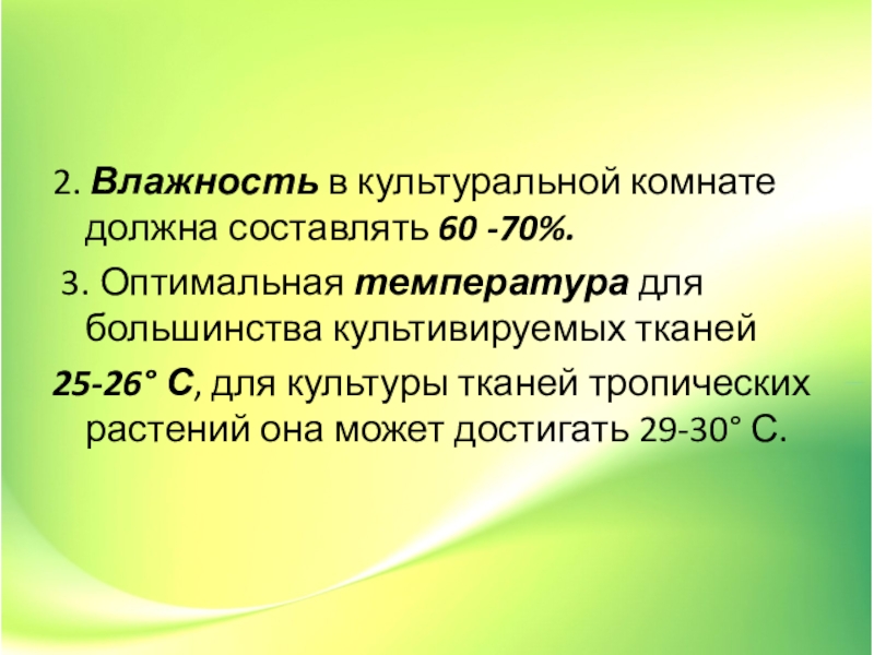 Слайд 202. Влажность в культуральной комнате должна составлять 60 -70%.