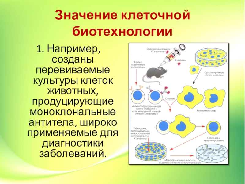 1. Например, созданы перевиваемые культуры клеток животных, продуцирующие моноклональные