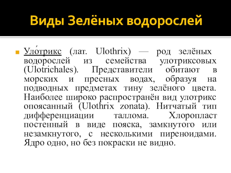 улотриксовых (Ulotrichales). Представители обитают в морских и пресных водах, образуя на подводных предметах тину зелёного цвета. Наиболее широко распространён вид улотрикс опоясанный (Ulothrix zonata). Нитчатый тип дифференциации таллома. Хлоропласт постенный в виде пояска, замкнутого или незамкнутого, с несколькими пиреноидами. Ядро одно, но без покраски не видно.