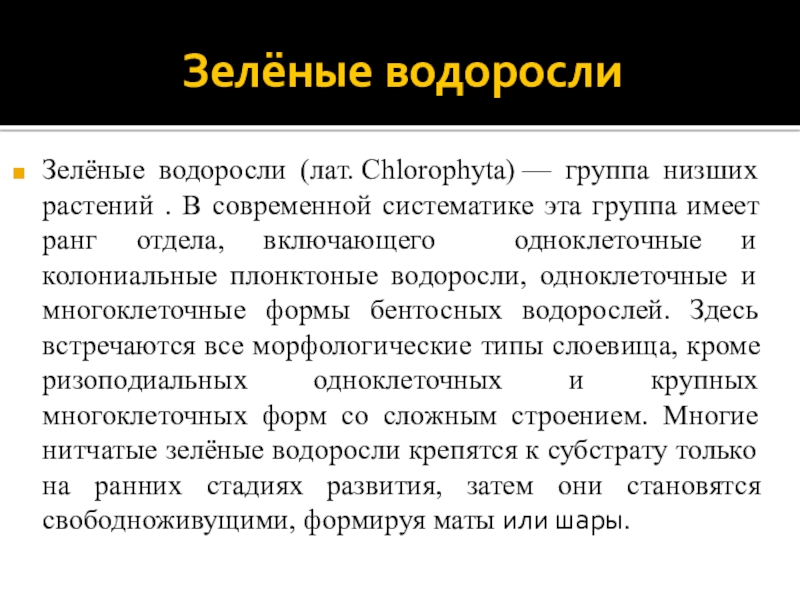 Зелёные водоросли (лат. Chlorophyta) — группа низших растений . В современной