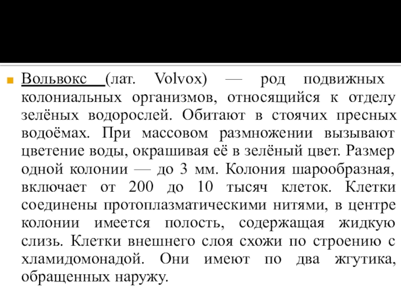 Слайд 6Вольвокс (лат. Volvox) — род подвижных колониальных организмов, относящийся к отделу