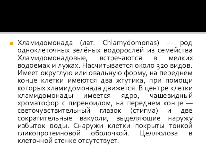 Слайд 7Хламидомонада (лат. Chlamydomonas) — род одноклеточных зелёных водорослей из семейства Хламидомонадовые,