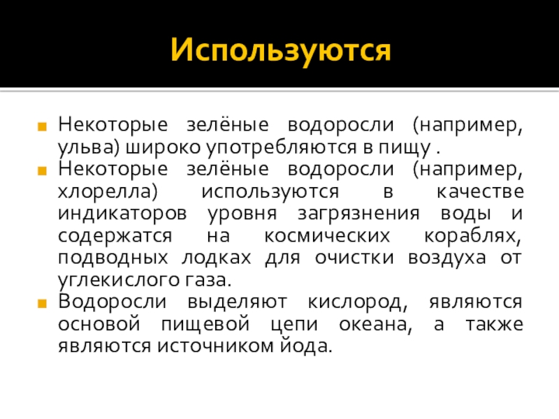 Некоторые зелёные водоросли (например, хлорелла) используются в качестве индикаторов уровня загрязнения воды и содержатся на космических кораблях, подводных лодках для очистки воздуха от углекислого газа.
