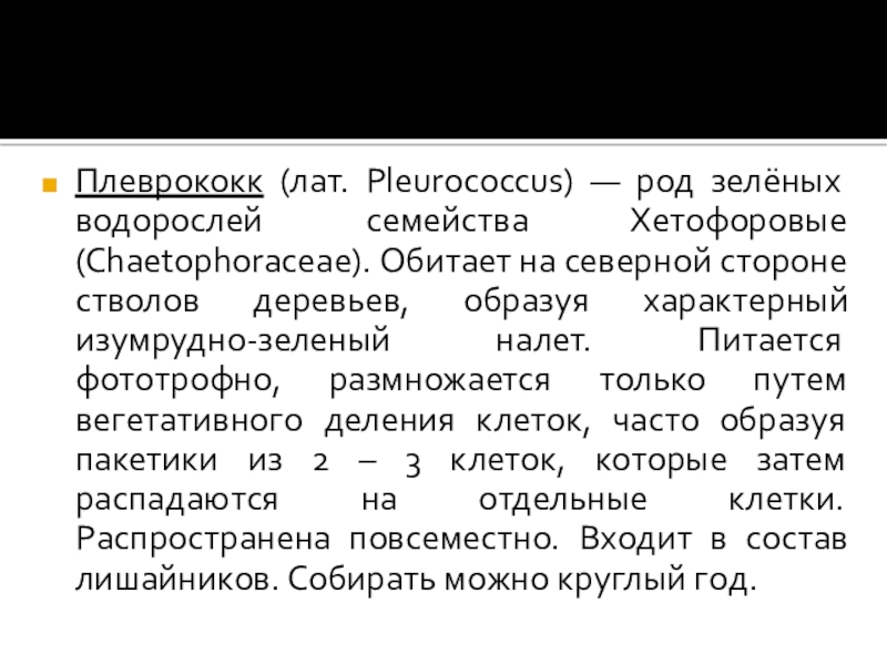 Слайд 10Плеврококк (лат. Pleurococcus) — род зелёных водорослей семейства Хетофоровые (Chaetophoraceae). Обитает