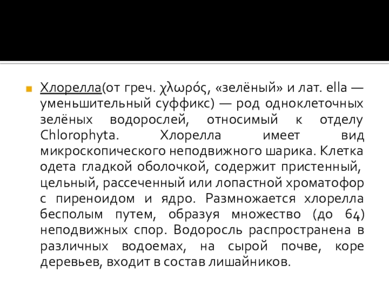 Слайд 9Хлорелла(от греч. χλωρός, «зелёный» и лат. ella — уменьшительный суффикс) —
