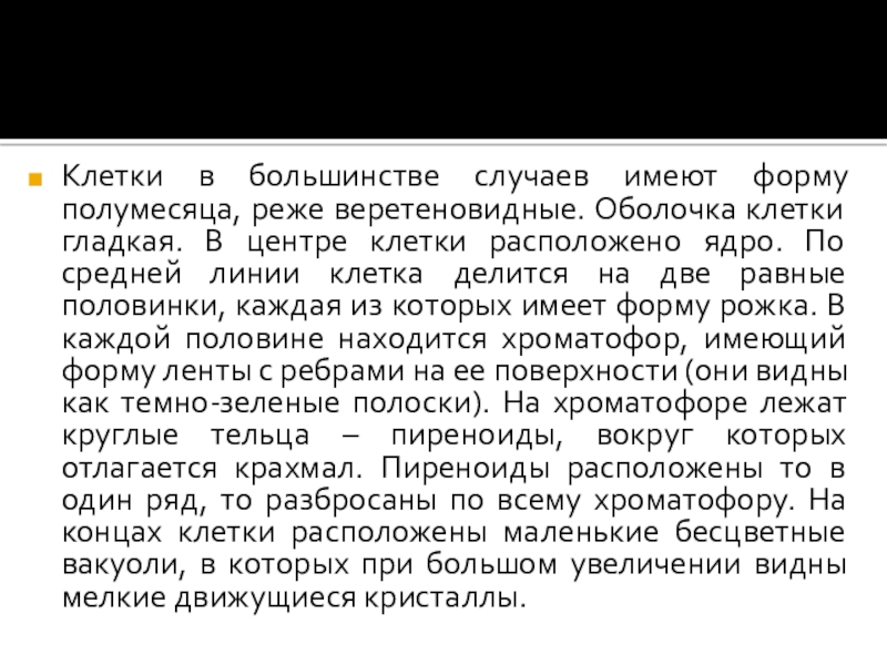 гладкая. В центре клетки расположено ядро. По средней линии клетка делится на две равные половинки, каждая из которых имеет форму рожка. В каждой половине находится хроматофор, имеющий форму ленты с ребрами на ее поверхности (они видны как темно-зеленые полоски). На хроматофоре лежат круглые тельца – пиреноиды, вокруг которых отлагается крахмал. Пиреноиды расположены то в один ряд, то разбросаны по всему хроматофору. На концах клетки расположены маленькие бесцветные вакуоли, в которых при большом увеличении видны мелкие движущиеся кристаллы.