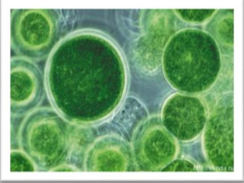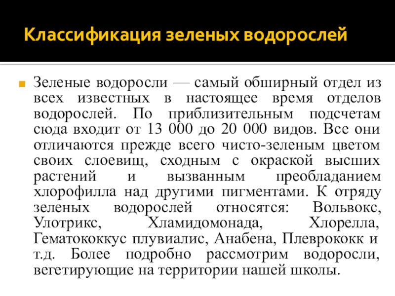 в настоящее время отделов водорослей. По приблизительным подсчетам сюда входит от 13 000 до 20 000 видов. Все они отличаются прежде всего чисто-зеленым цветом своих слоевищ, сходным с окраской высших растений и вызванным преобладанием хлорофилла над другими пигментами. К отряду зеленых водорослей относятся: Вольвокс, Улотрикс, Хламидомонада, Хлорелла, Гематококкус плувиалис, Анабена, Плеврококк и т.д. Более подробно рассмотрим водоросли, вегетирующие на территории нашей школы.