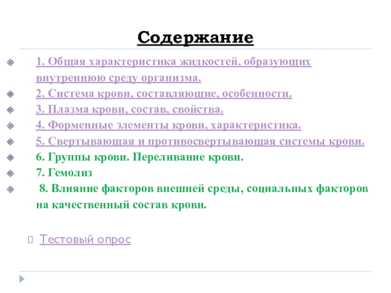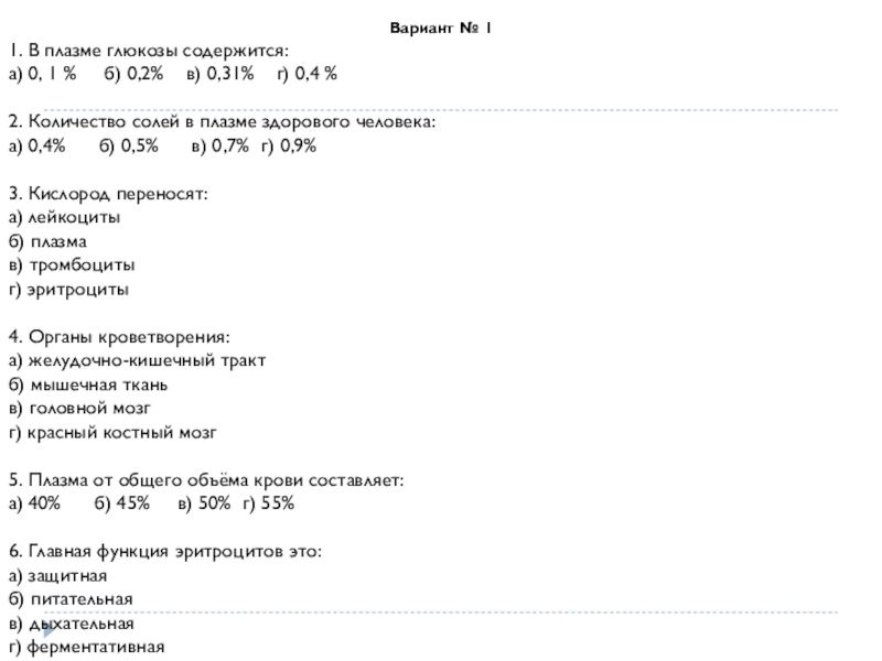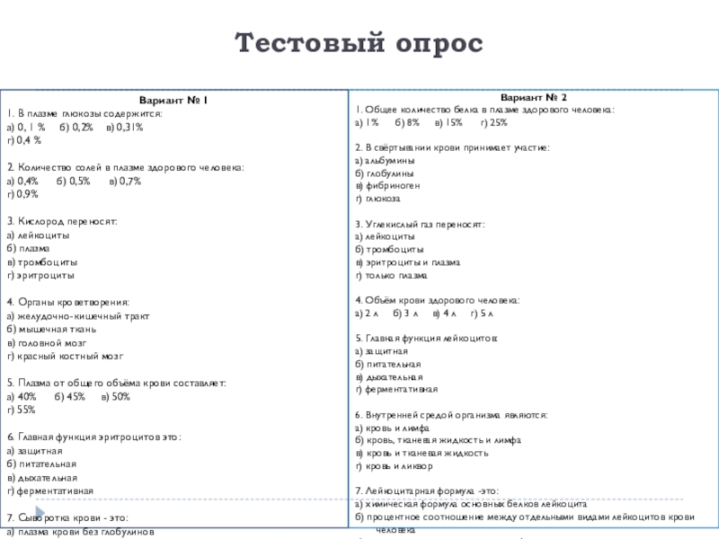 Составить тестовый опрос по теме «Анатомо-физиологические особенности системы крови»