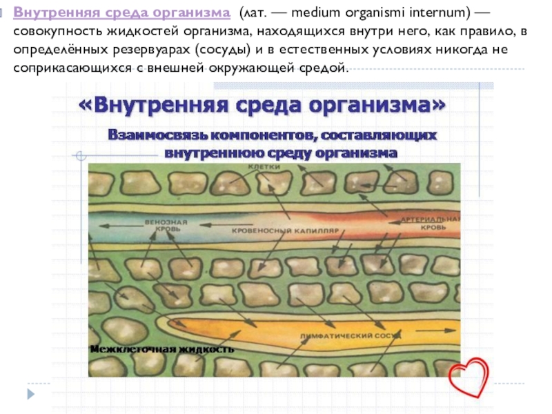 Слайд 8Внутренняя среда организма (лат. — medium organismi internum) — совокупность жидкостей организма, находящихся