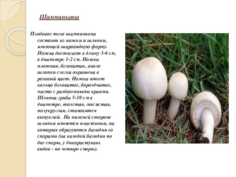Плодовое тело шампиньона состоит из ножки и шляпки, имеющей шаровидную форму.