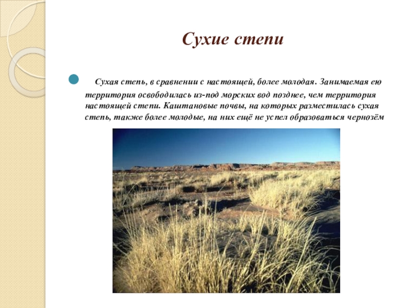 ею территория освободилась из-под морских вод позднее, чем территория настоящей степи. Каштановые почвы, на которых разместилась сухая степь, также более молодые, на них ещё не успел образоваться чернозём