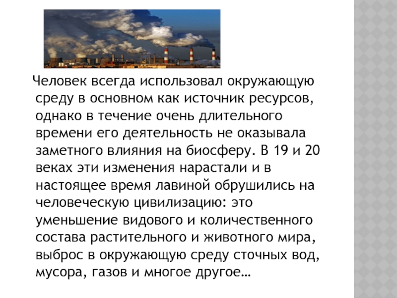 однако в течение очень длительного времени его деятельность не оказывала заметного влияния на биосферу. В 19 и 20 веках эти изменения нарастали и в настоящее время лавиной обрушились на человеческую цивилизацию: это уменьшение видового и количественного состава растительного и животного мира, выброс в окружающую среду сточных вод, мусора, газов и многое другое…