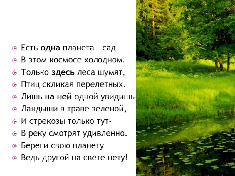 Есть одна планета – садВ этом космосе холодном.Только здесь леса шумят,Птиц скликая перелетных.Лишь на ней одной увидишь-Ландыши
