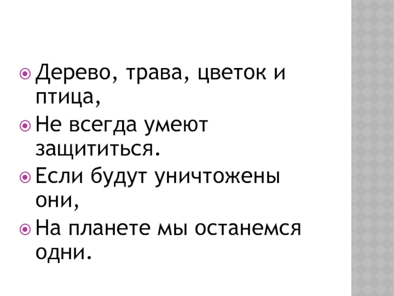 Дерево, трава, цветок и птица,Не всегда умеют защититься.Если будут уничтожены они, На планете мы останемся одни.