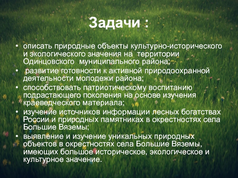 выявление и изучение уникальных природных объектов в окрестностях села Большие Вяземы, имеющих большое историческое, экологическое и культурное значение.