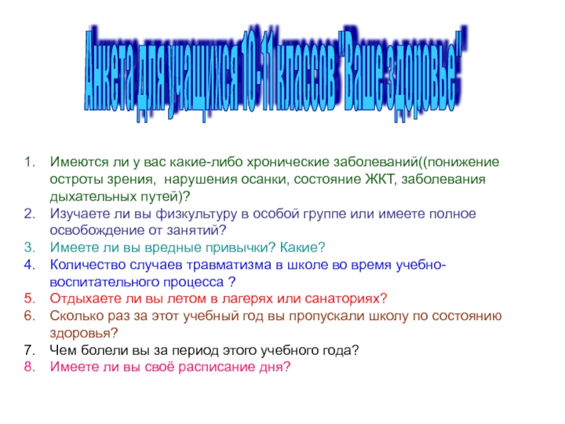 Провести анкетирование старших школьников и составлений диаграмм наиболее часто встречаемых болезней;