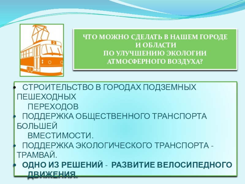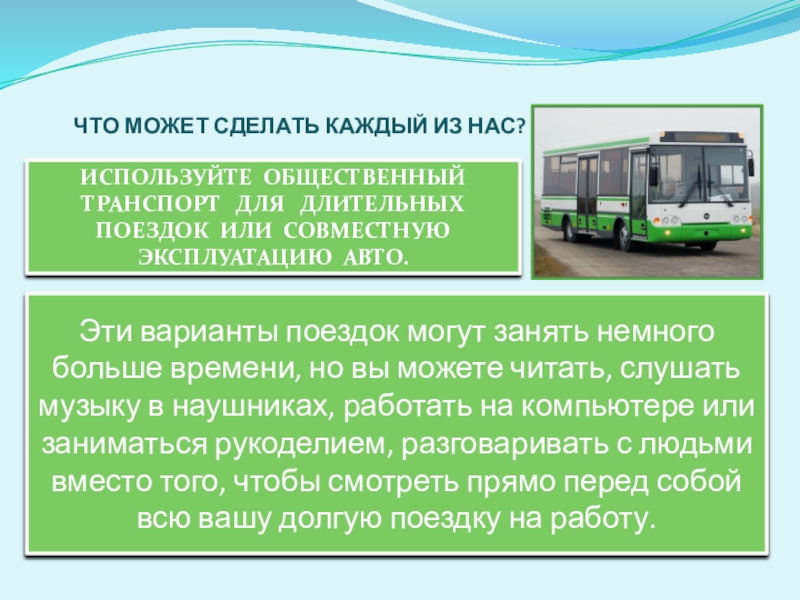 ЧТО МОЖЕТ СДЕЛАТЬ КАЖДЫЙ ИЗ НАС?ИСПОЛЬЗУЙТЕ ОБЩЕСТВЕННЫЙ ТРАНСПОРТ  ДЛЯ  ДЛИТЕЛЬНЫХ ПОЕЗДОК ИЛИ СОВМЕСТНУЮ ЭКСПЛУАТАЦИЮ АВТО.Эти