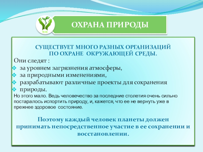 СУЩЕСТВУЕТ МНОГО РАЗНЫХ ОРГАНИЗАЦИЙ ПО ОХРАНЕ ОКРУЖАЮЩЕЙ СРЕДЫ. Они следят :за уровнем загрязнения атмосферы, за природными изменениями,