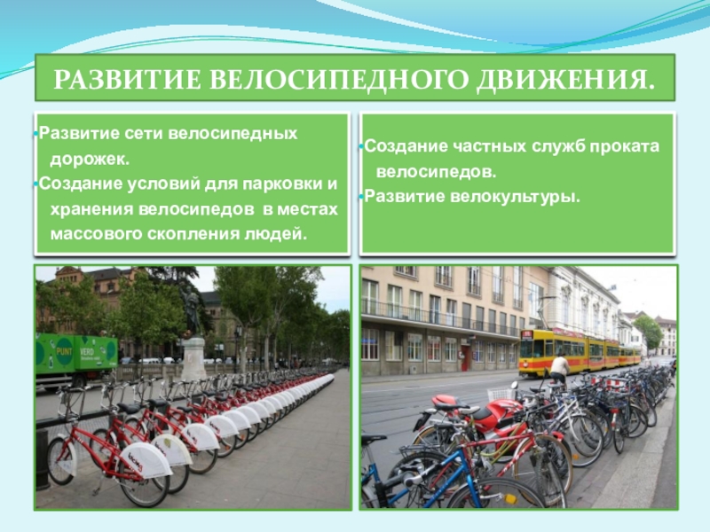 РАЗВИТИЕ ВЕЛОСИПЕДНОГО ДВИЖЕНИЯ.Развитие сети велосипедных  дорожек.Создание условий для парковки и  хранения велосипедов в местах