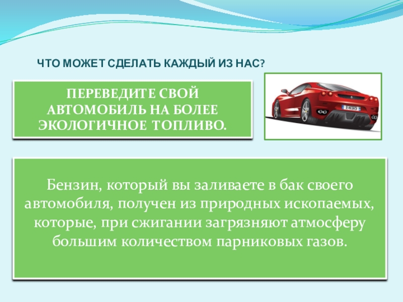 ЧТО МОЖЕТ СДЕЛАТЬ КАЖДЫЙ ИЗ НАС?ПЕРЕВЕДИТЕ СВОЙ АВТОМОБИЛЬ НА БОЛЕЕ ЭКОЛОГИЧНОЕ ТОПЛИВО.Бензин, который вы заливаете в бак
