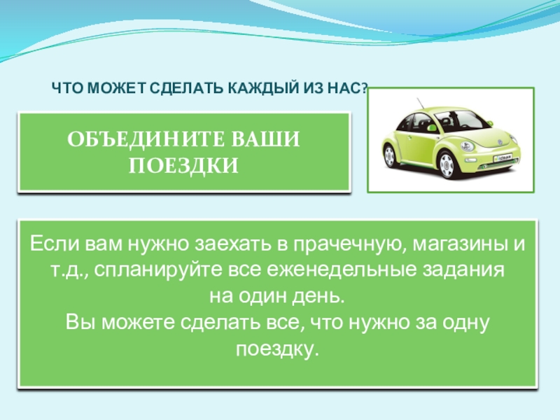 ЧТО МОЖЕТ СДЕЛАТЬ КАЖДЫЙ ИЗ НАС?ОБЪЕДИНИТЕ ВАШИ ПОЕЗДКИЕсли вам нужно заехать в прачечную, магазины и т.д., спланируйте