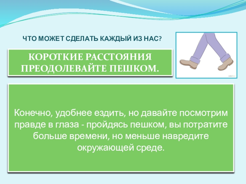 ЧТО МОЖЕТ СДЕЛАТЬ КАЖДЫЙ ИЗ НАС?КОРОТКИЕ РАССТОЯНИЯ ПРЕОДОЛЕВАЙТЕ ПЕШКОМ.Конечно, удобнее ездить, но давайте посмотрим правде в глаза