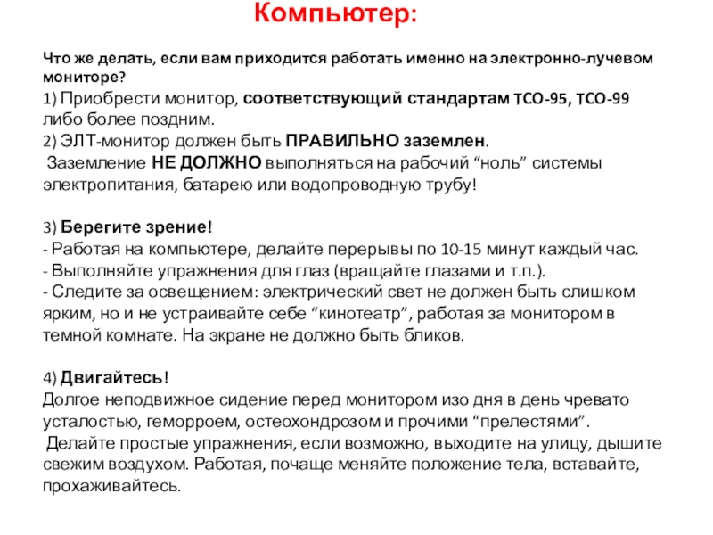 1) Приобрести монитор, соответствующий стандартам TCO-95, TCO-99 либо более поздним.
