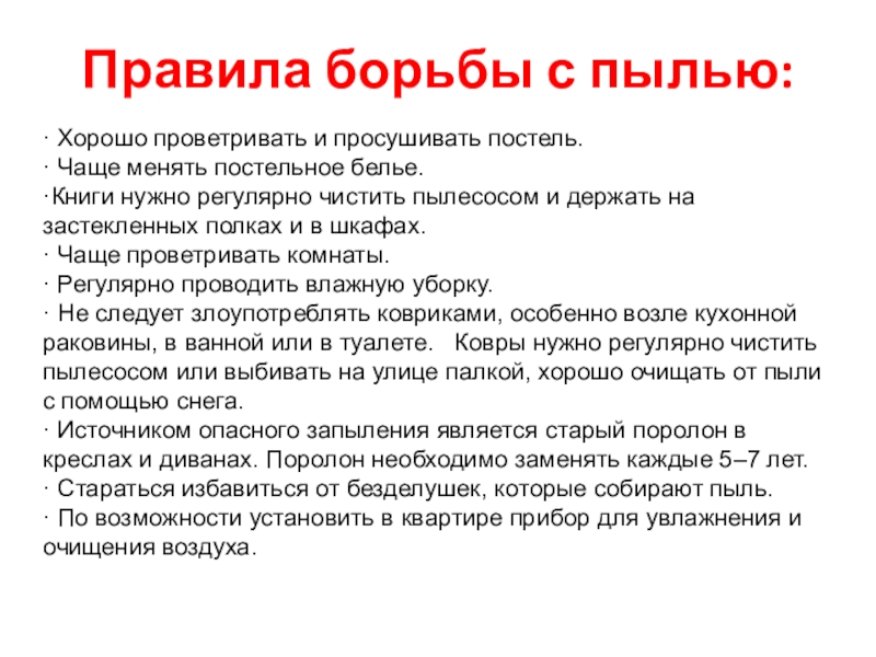 · Источником опасного запыления является старый поролон в креслах и диванах. Поролон необходимо заменять каждые 5–7 лет.