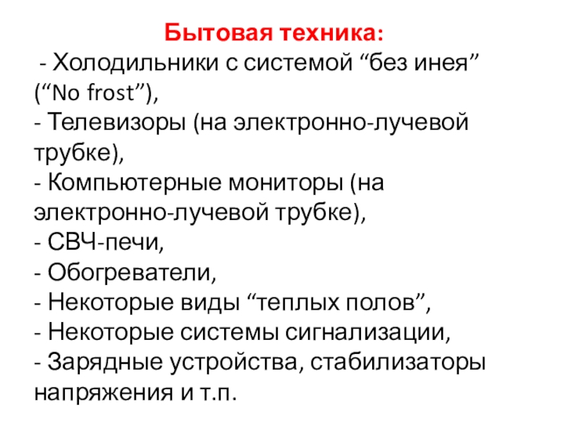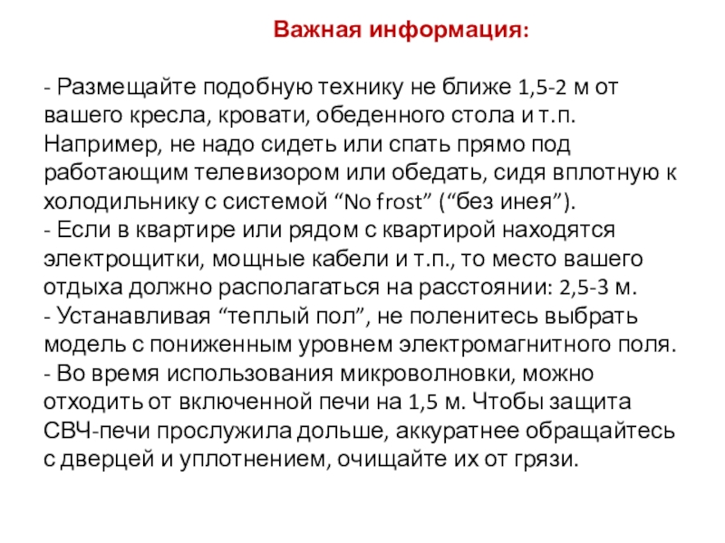 - Размещайте подобную технику не ближе 1,5-2 м от вашего кресла, кровати, обеденного стола и т.п. Например, не надо сидеть или спать прямо под работающим телевизором или обедать, сидя вплотную к холодильнику с системой “No frost” (“без инея”).