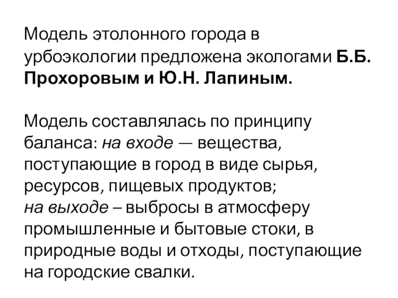 Слайд 3Модель этолонного города в урбоэкологии предложена экологами Б.Б. Прохоровым и Ю.Н.