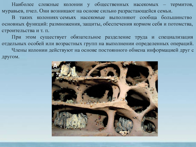 Слайд 12 Наиболее сложные колонии у общественных насекомых – термитов, муравьев, пчел. Они