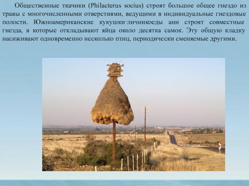 Слайд 10 Общественные ткачики (Philacterus socius) строят большое общее гнездо из травы с