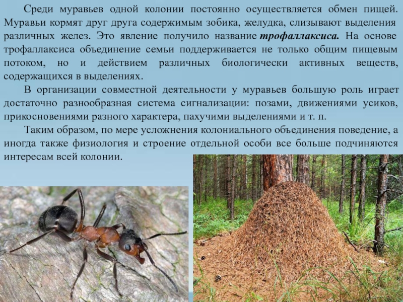 Слайд 14 Среди муравьев одной колонии постоянно осуществляется обмен пищей. Муравьи кормят друг