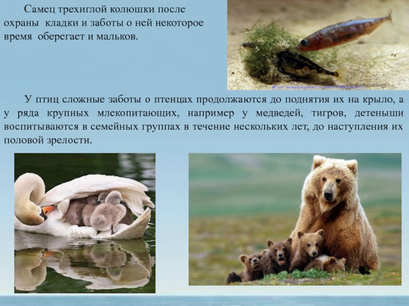 У птиц сложные заботы о птенцах продолжаются до поднятия их на крыло, а у ряда крупных млекопитающих, например у медведей, тигров, детеныши воспитываются в семейных группах в течение нескольких лет, до наступления их половой зрелости.