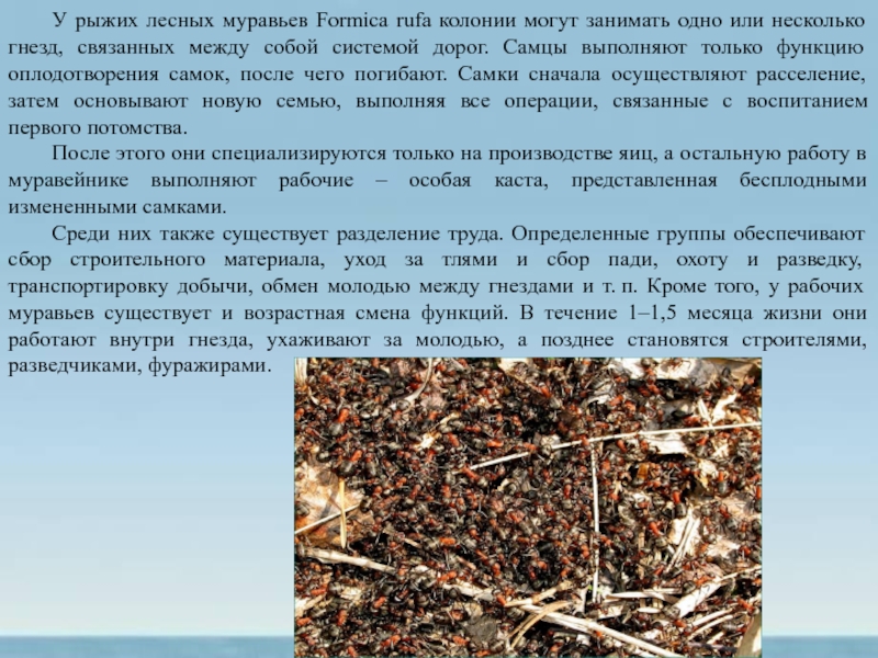 Слайд 13 У рыжих лесных муравьев Formica rufa колонии могут занимать одно или