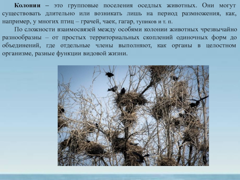 Слайд 6 Колонии – это групповые поселения оседлых животных. Они могут существовать длительно