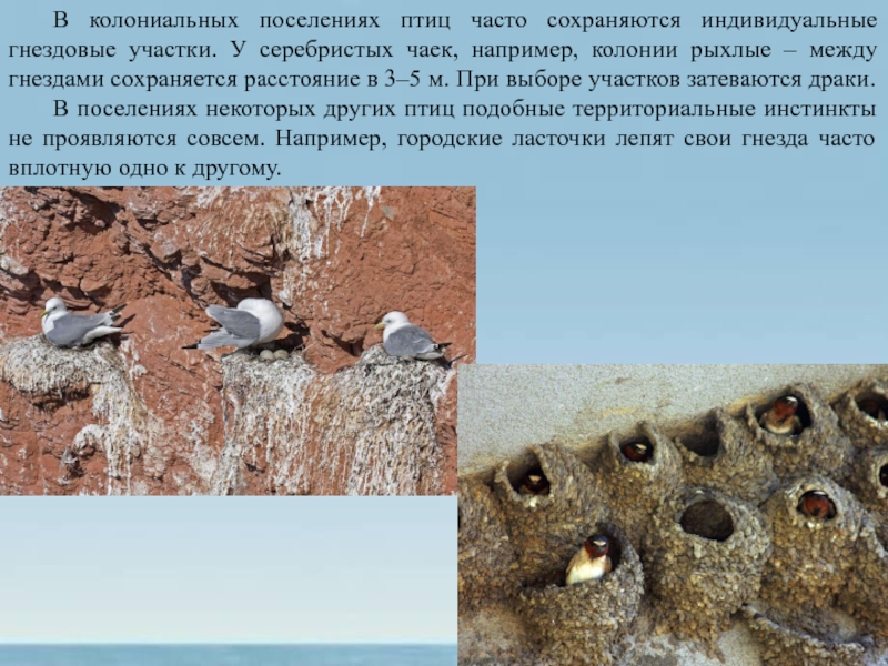 Слайд 9 В колониальных поселениях птиц часто сохраняются индивидуальные гнездовые участки. У серебристых