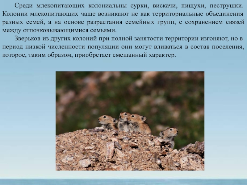 Слайд 11 Среди млекопитающих колониальны сурки, вискачи, пищухи, пеструшки. Колонии млекопитающих чаще возникают