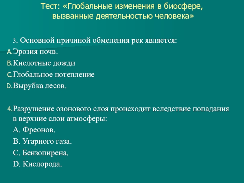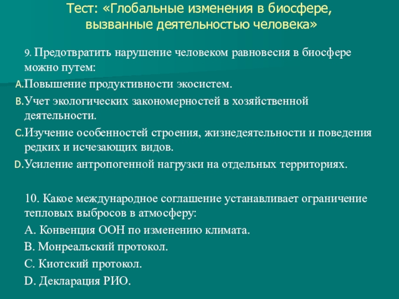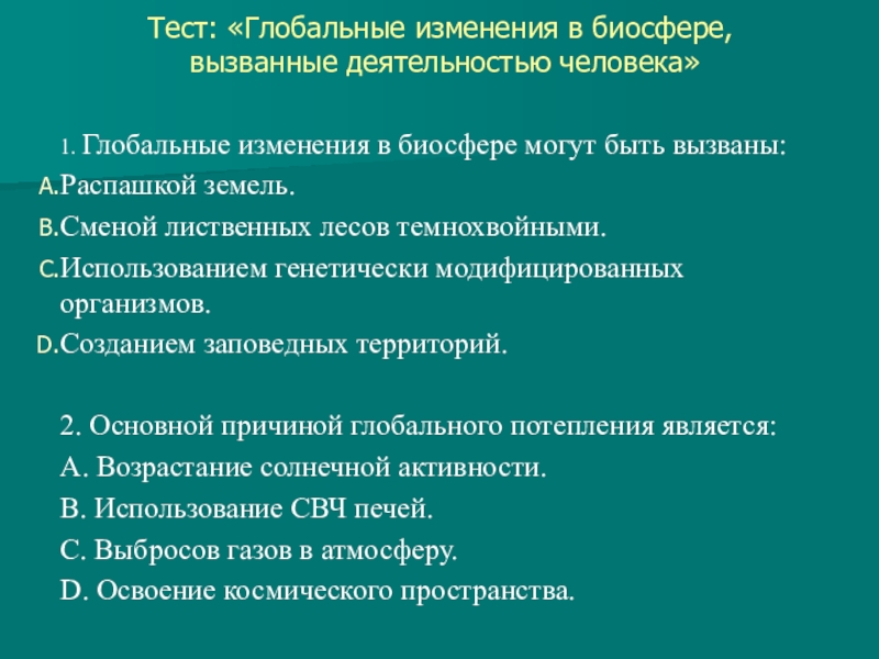 Слайд 10Тест: «Глобальные изменения в биосфере,