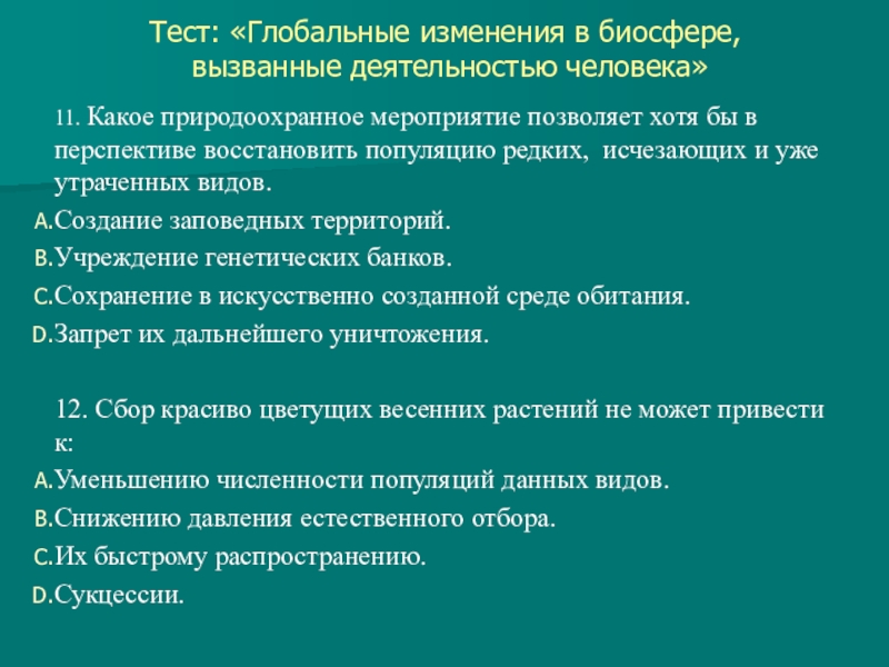Слайд 11Тест: «Глобальные изменения в биосфере,