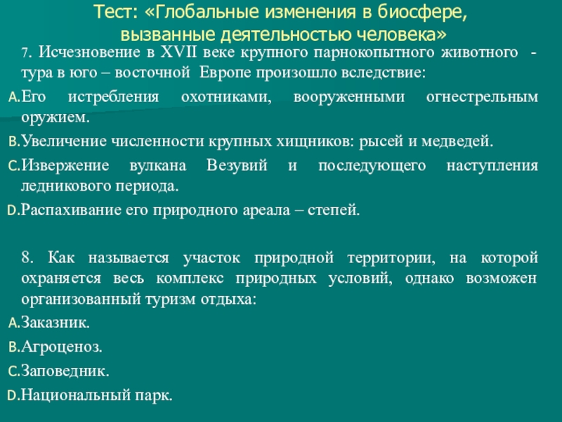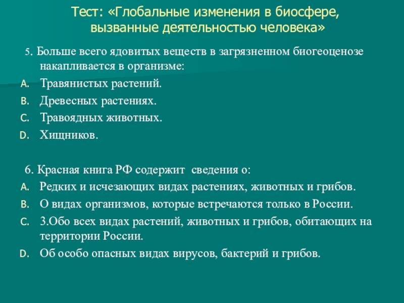 Слайд 8Тест: «Глобальные изменения в биосфере,