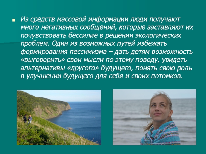 их почувствовать бессилие в решении экологических проблем. Один из возможных путей избежать формирования пессимизма – дать детям возможность «выговорить» свои мысли по этому поводу, увидеть альтернативы «другого» будущего, понять свою роль в улучшении будущего для себя и своих потомков.
