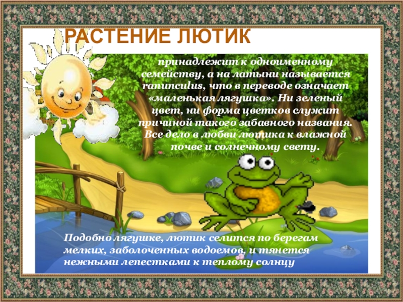 Подобно лягушке, лютик селится по берегам мелких, заболоченных водоемов, и тянется нежными лепестками к теплому солнцу
