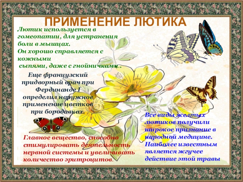 Лютик используется в гомеопатии, для устранения боли в мышцах.