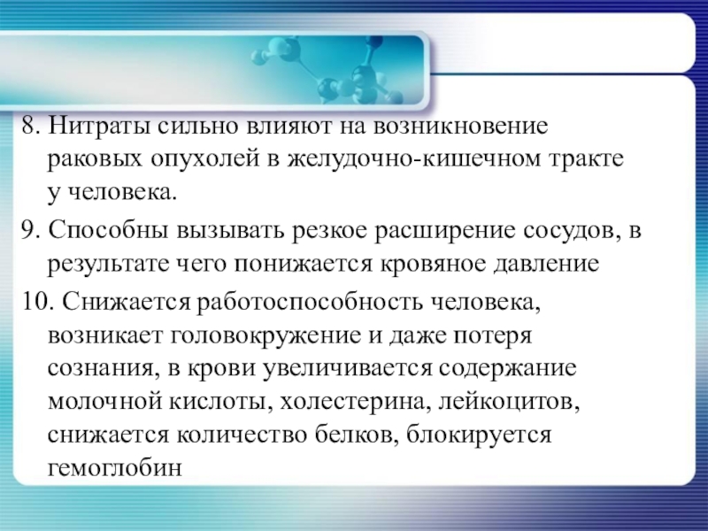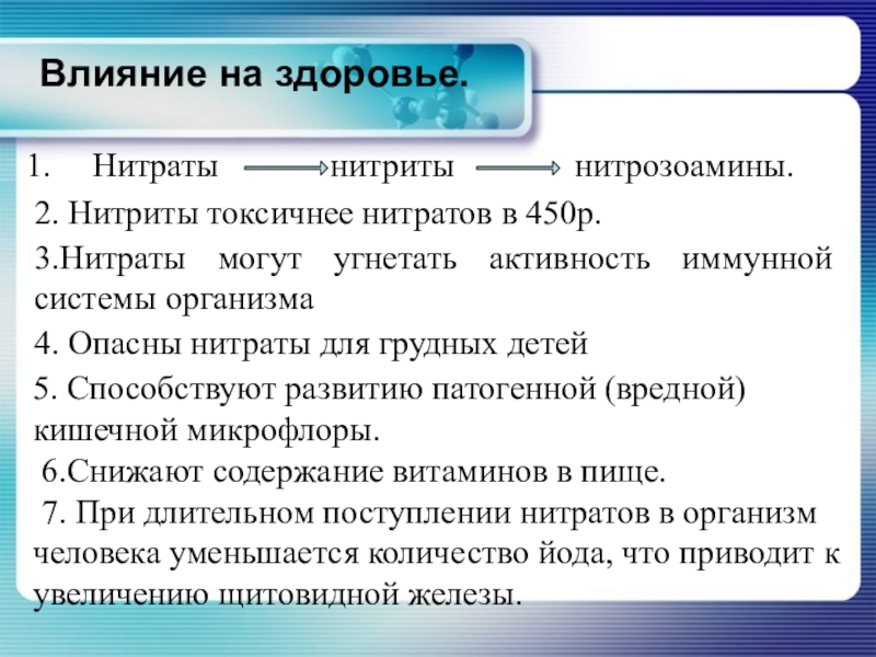 7. При длительном поступлении нитратов в организм человека уменьшается количество йода, что приводит к увеличению щитовидной железы.