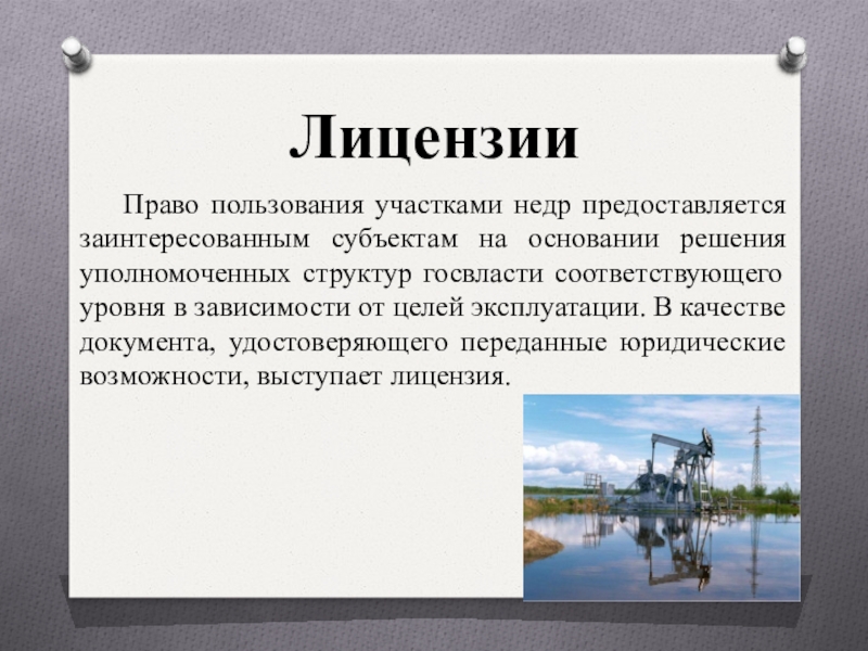 уполномоченных структур госвласти соответствующего уровня в зависимости от целей эксплуатации. В качестве документа, удостоверяющего переданные юридические возможности, выступает лицензия.