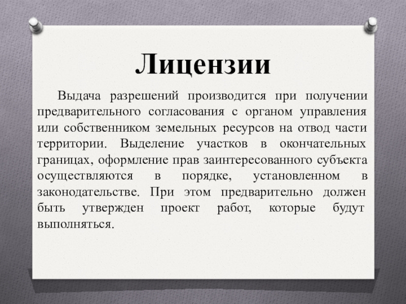 или собственником земельных ресурсов на отвод части территории. Выделение участков в окончательных границах, оформление прав заинтересованного субъекта осуществляются в порядке, установленном в законодательстве. При этом предварительно должен быть утвержден проект работ, которые будут выполняться.