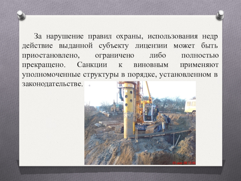 Слайд 17 За нарушение правил охраны, использования недр действие выданной субъекту лицензии может