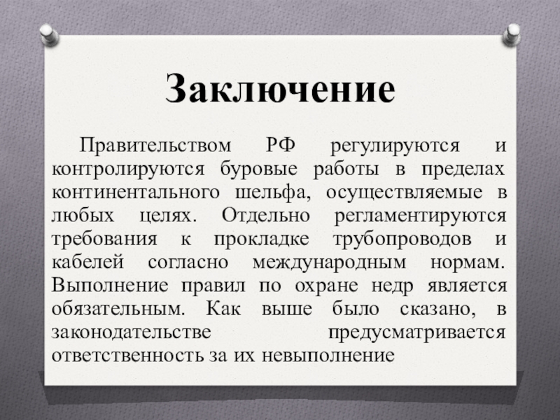 шельфа, осуществляемые в любых целях. Отдельно регламентируются требования к прокладке трубопроводов и кабелей согласно международным нормам. Выполнение правил по охране недр является обязательным. Как выше было сказано, в законодательстве предусматривается ответственность за их невыполнение